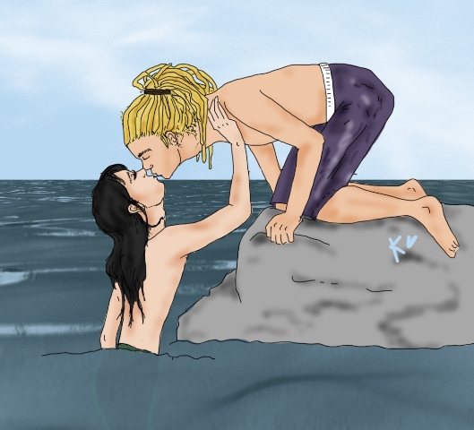 „Myslíš….Že bysm-fuj-me… mohli zphomali-bleh…“ plival Tom vodu, která se mu dostávala do pusy, voda nebyla zrovna nejklidnější. Bill se otočil, mile se usmál a doplaval ke skále, která vykukovala z vody. Tom k ní po chvilce doplaval a vděčně na ni vylezl, celý udýchaný se na ni rozvalil. „Díky…“ vydechl, nakrčil obočí a rozesmál se. „Bože, nech toho! Přestaň!“ Bill ho lechtal na noze, a když mu bylo řečeno, ať toho nechá, tak přestal a odtáhl prst zpátky. Zvědavě na něj koulel oči. Tom se posadil a zadíval se na něj. „Máš neuvěřitelně velké oči, víš to? A řasy… M-můžu?“ natáhl k němu ruku a Bill přikývl, trochu se vyzdvihl na skalku a natáhl k člověkovi krk. Zavřel oči. Tom se trošku váhavě konečky prstů dotkl jeho dlouhých řas, které se jemně chvěly.